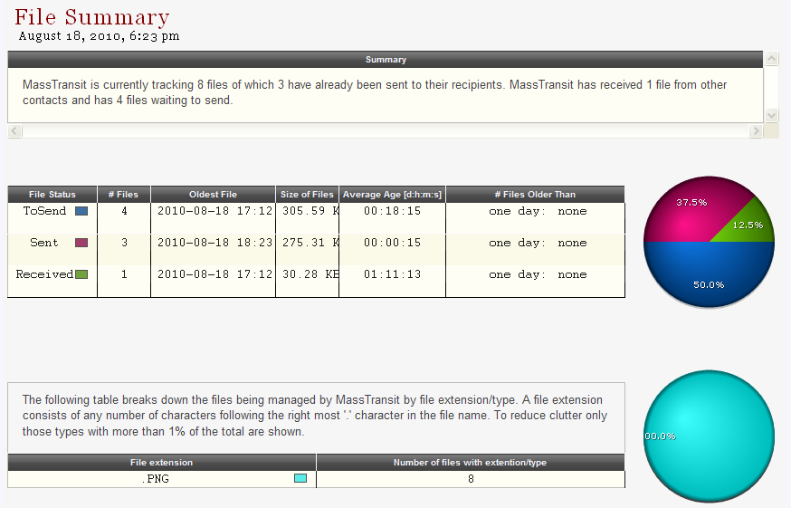 The File Summary displays a high level view of files in the system including number and size of files to send, sent, and received. You can also see information about the transferred file types.