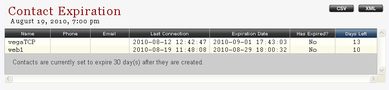 The Contact Expiration report displays a complete list of contacts that have expired or will expire in the next 30 days.