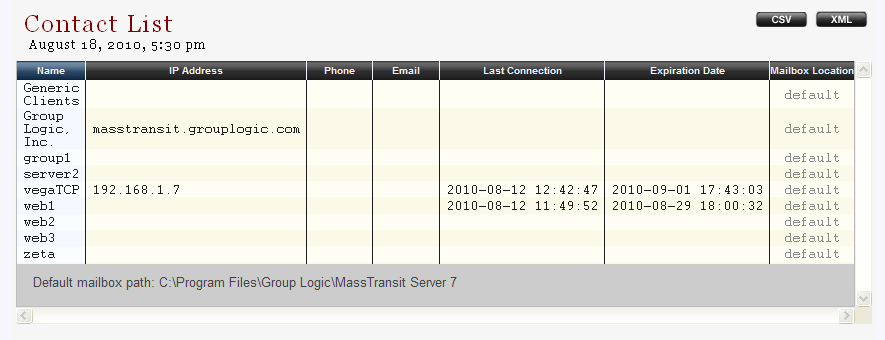 The Contact List report displays a complete list of contacts with configuration information about the contacts' IP addresses, phone, email address, time of last connection, expiration date (if configured), and mailbox location.