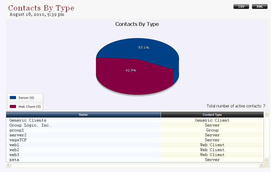 The Contacts by Type report lists all active contacts and their type. The report also displays a graph with the active contacts by type.