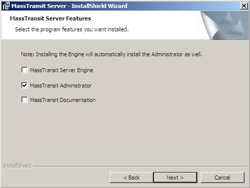 The "MassTransit Server Features" window appears next. Select MassTransit Administrator and click Next: