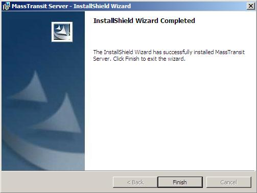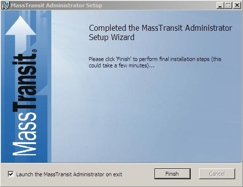 Click Finish. The Launch MassTransit Administrator on exit check box is selected by default. Uncheck it if you do not want the launch the administrator now.