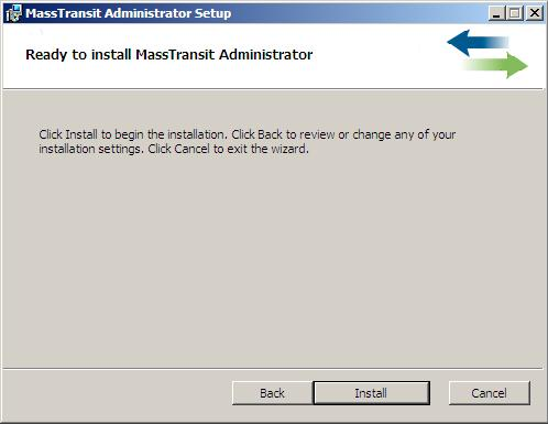 The "Ready to install MassTransit Administrator" window appears next. If you need to review or change the installation settings, click Back. When ready, click Install.