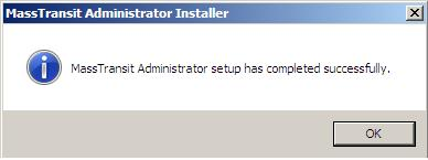 A message from the MassTransit Administrator Installer should appear stating that the MassTransit Administrator setup has completed successfully. Click OK.
