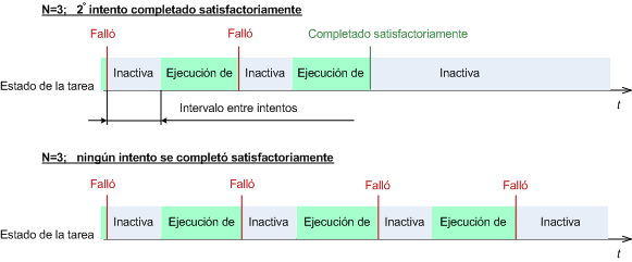 Si selecciona la casilla de verificación Reiniciar una tarea que falló y especifica la cantidad de intentos y el intervalo de tiempo entre los mismos, el programa intentará ejecutar la tarea que falló nuevamente. El programa dejará de intentar tan pronto como un intento finalice correctamente o se haya realizado el número de intentos especificados, lo que suceda primero.