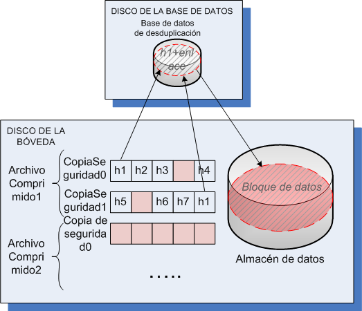 Antes de enviar el bloque de datos a la bóveda, el agente le pide a la base de datos de deduplicación que determine si el valor hash del bloque es el mismo que el de algún bloque ya almacenado. Si es así, el agente solo envía el valor hash; de lo contrario, envía el bloque mismo. El nodo de almacenamiento guarda los bloques de datos recibidos en un archivo temporal.