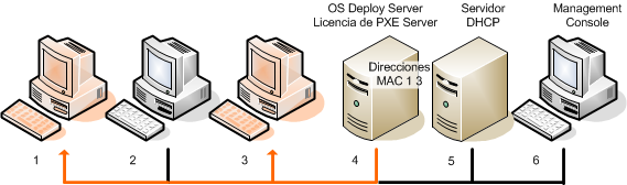 La siguiente imagen ilustra la implementación en determinados equipos de una única subred. Si los equipos de destino están situados en otra subred, es posible que tenga que efectuar pasos adicionales antes de crear la tarea de implementación.