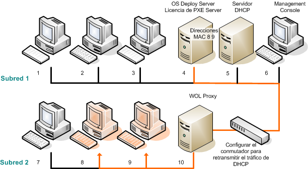 Implementación en otra red mediante la utilización de Acronis Wake-on-LAN Proxy. El conmutador de red está configurado para reproducir el tráfico PXE y el tráfico DHCP.