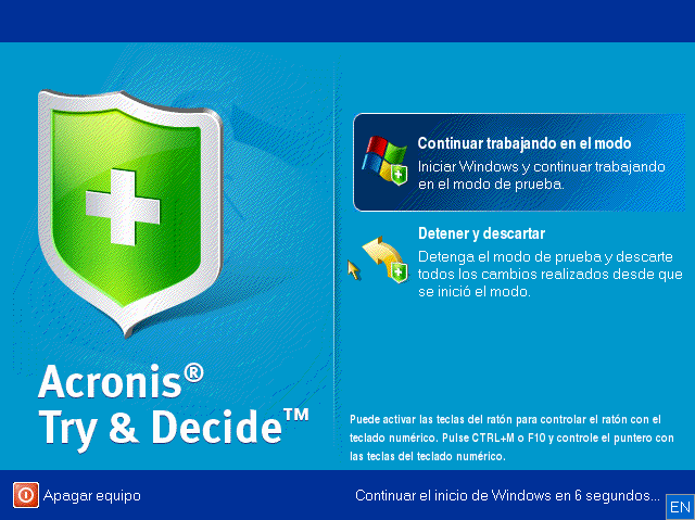 Cuando se haya iniciado el modo Try, no podrá utilizar el Acronis Startup Recovery Manager, activado anteriormente. Al reiniciar el ordenador en el modo Try, podrá utilizar Acronis Startup Recovery Manager de nuevo.