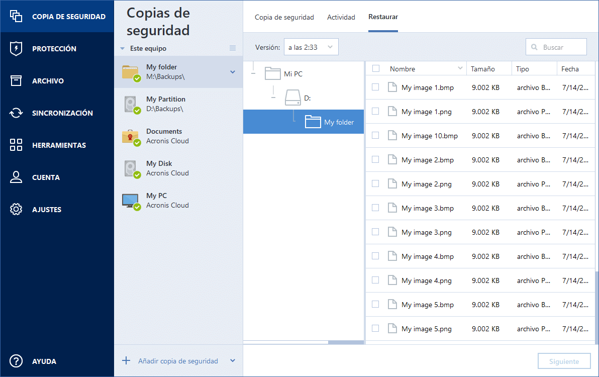 Puede buscar y recuperar archivos y carpetas respaldados en Acronis True Image, en el Explorador de archivos o en Acronis Cloud. Puede recuperar archivos y carpetas tanto de copias de seguridad a nivel de archivo como de copias de seguridad a nivel de disco.