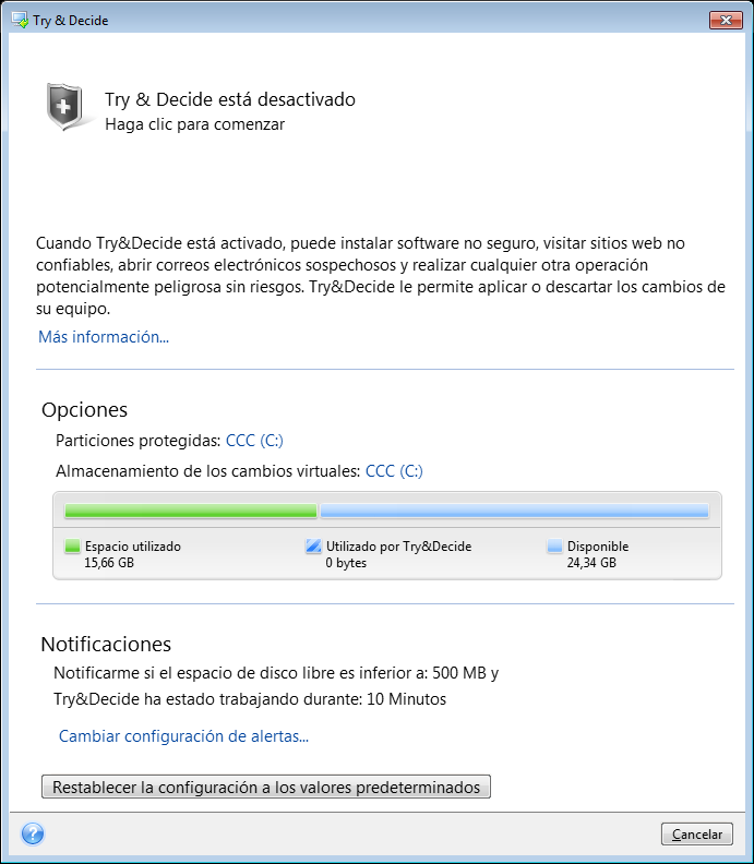 Tenga en cuenta que Try&Decide no puede rastrear cambios en las particiones del disco, por lo que no podrá utilizar el modo Try para operaciones virtuales con particiones, como cambiar el tamaño de las particiones o su distribución. Además, no debe usar Try&Decide y las utilidades de desfragmentación del disco o comprobación de errores del disco al mismo tiempo ya que esto puede dañar de manera irreparable el sistema de archivos así como hacer que el disco del sistema no pueda iniciar.
