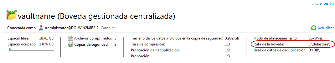 El archivo de almacén de datos tiene la extensión *.ds.0 o *.ds.1. Dos archivos con estas extensiones se encuentran en la bóveda mientras la compactación se encuentra en curso. Si encontrara dos archivos, use la suma de ambos tamaños de archivo para estimar el tiempo de actualización.
