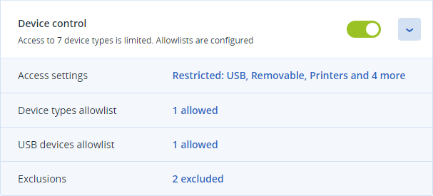 - Lista de tipos de dispositivo permitidos: Muestra cuántas subclases de dispositivo se permiten al excluirlos del control del acceso del dispositivo, si corresponde. De lo contrario, indica que la lista blanca está vacía. Haga clic en este resumen para ver o cambiar la selección de subclases de dispositivo permitidas (consulte cómo excluir subclases de dispositivo del control de acceso).