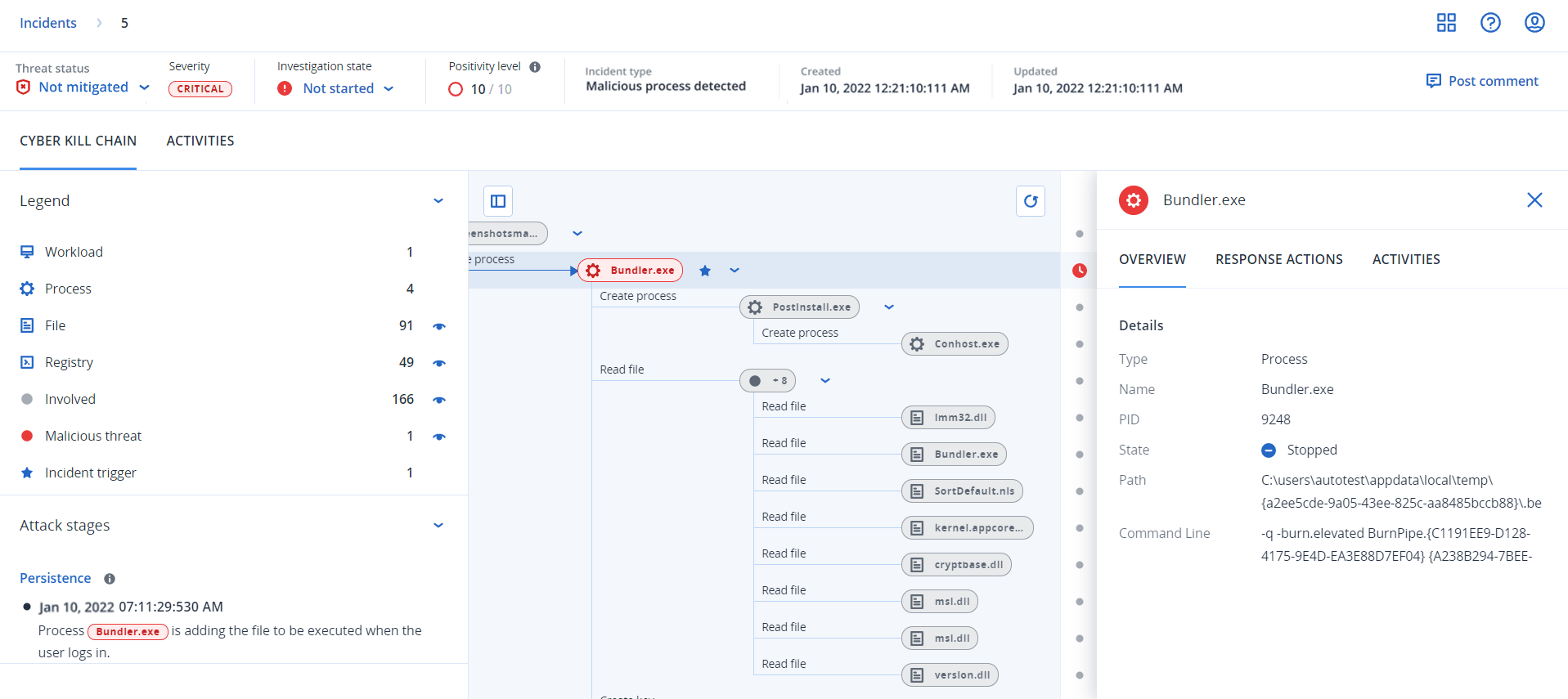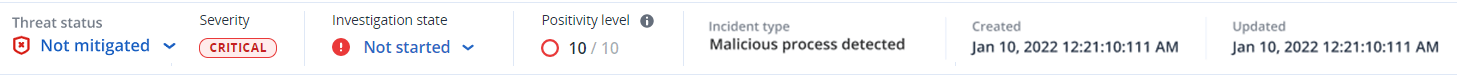 - Estado actual de la amenaza: El sistema define automáticamente el estado de la amenaza. Los incidentes con el estado No mitigado deben investigarse lo antes posible.Un incidente se establece como Mitigado cuando se ha completado correctamente una restauración desde la copia de seguridad o cuando se han solucionado correctamente todas las detecciones mediante una acción de detención del proceso, cuarentena o reversión.