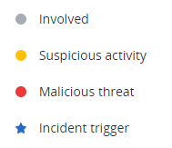 - En la leyenda se utilizan cuatro colores principales que le permiten entender rápidamente qué ha pasado en cada nodo de la cyber kill chain, tal y como se muestra más abajo. Estos nodos con códigos de color también se incluyen en las fases del ataque, como se describe en Investigue las fases del ataque de un incidente.
