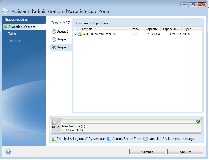 Il n'est pas possible de créer de zone Acronis Secure Zone sur des disques et volumes dynamiques.