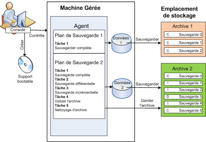 Pour cela, vous devez au moins spécifier les données à protéger et l'emplacement où l'archive de sauvegarde sera stockée. Ceci créera un plan de sauvegarde minimal qui sera composé d'une tâche qui créera une sauvegarde complète de vos données à chaque démarrage manuel de la tâche. Un plan de sauvegarde complexe peut être composé de plusieurs tâches exécutées suivant une planification ; créer des sauvegardes complètes, incrémentielles ou différentielles ; effectuer les opérations de maintenance d'archive telles que la validation de sauvegarde ou la suppression de sauvegardes ayant expiré (nettoyage d'archive). Vous pouvez personnaliser les opérations de sauvegarde en utilisant diverses options de sauvegarde, telles que les commandes de sauvegarde avant/après, la limitation de la bande passante réseau, le traitement des erreurs ou les options de notification.