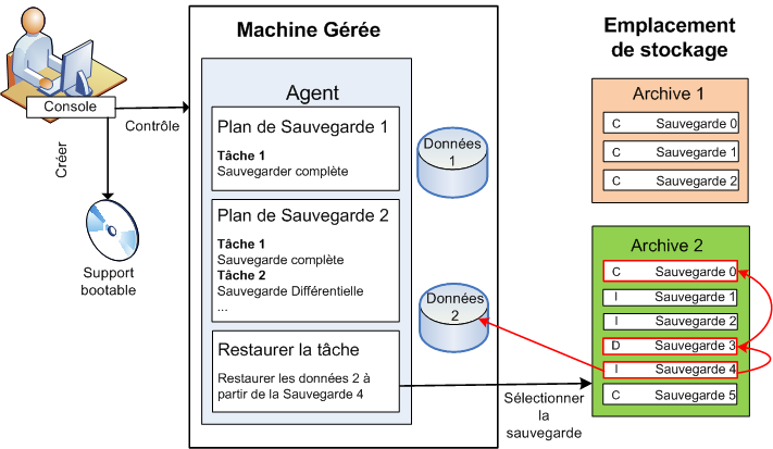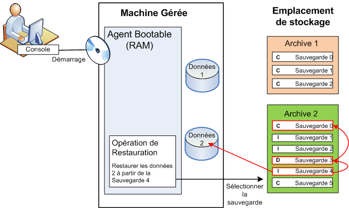 Si la machine ne démarre pas ou si vous devez restaurer des données sur une machine sans système d'exploitation de base, vous pouvez démarrer la machine à partir du support amorçable et configurer l'opération de restauration de la même manière que la tâche de restauration. Le diagramme suivant illustre la restauration à l'aide d'un support amorçable.
