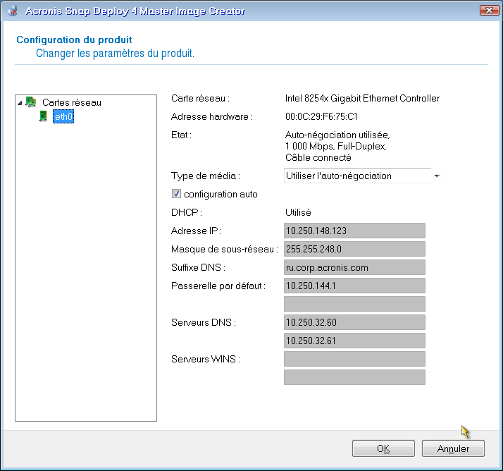 Par défaut, Acronis Snap Deploy 4 Master Image Creator utilise la configuration automatique DHCP. Ignorez l'invitation (en cliquant sur Annuler) si un serveur DHCP est présent sur le réseau ou si l'image doit être placée sur un disque dur ou un support amovible.