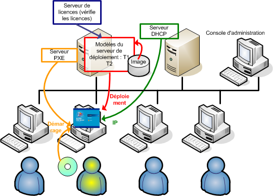 Les utilisateurs qui doivent redéployer leurs machines les démarrent à partir du support de démarrage ou du serveur PXE, puis sélectionnent le modèle par son nom dans le menu de démarrage. Le déploiement commence immédiatement et se déroule de façon indépendante sur chaque machine.