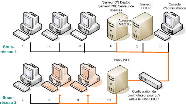 Si le serveur Acronis Snap Deploy 4 OS Deploy est installé dans un sous-réseau (sous-réseau 1) et les machines cibles dans un autre sous-réseau (sous-réseau 2), préparez le déploiement de la façon suivante :