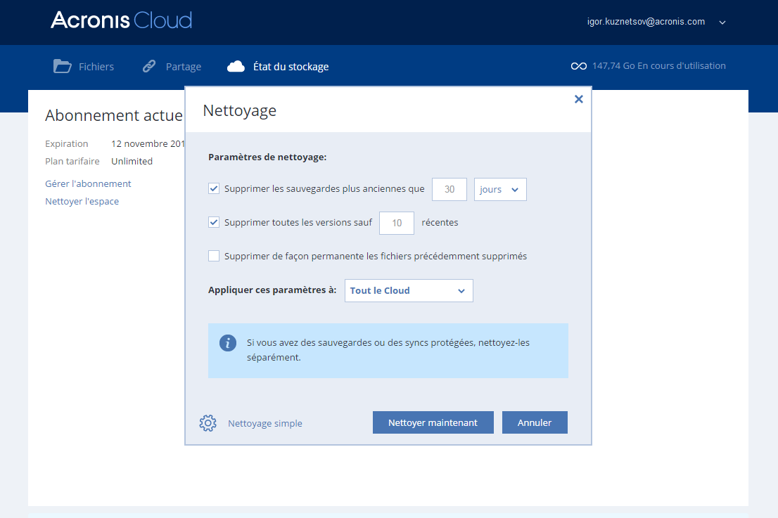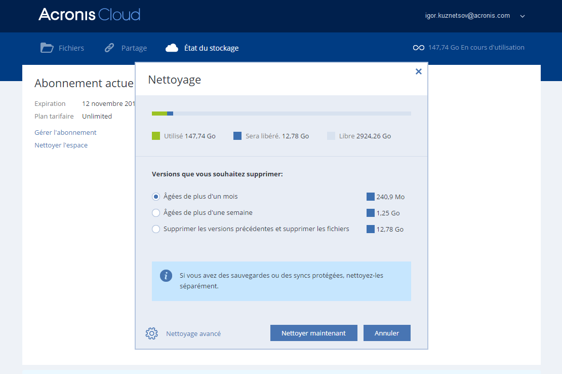 Vous pouvez nettoyer votre espace Acronis Cloud afin de libérer de l'espace pour des données plus récentes.