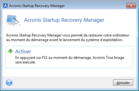 Remarque : vous ne pouvez pas utiliser Acronis Startup Recovery Manager sur les tablettes fonctionnant sous Windows.