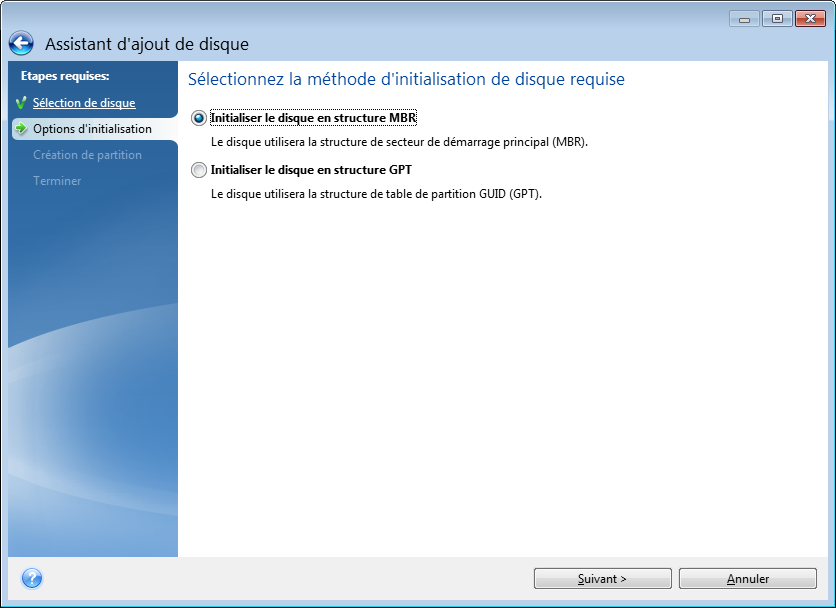 Si vous utilisez une version 32 bits de Windows XP, la méthode d'initialisation du GPT n'est pas disponible, et l'étape Options d'initialisation est absente.