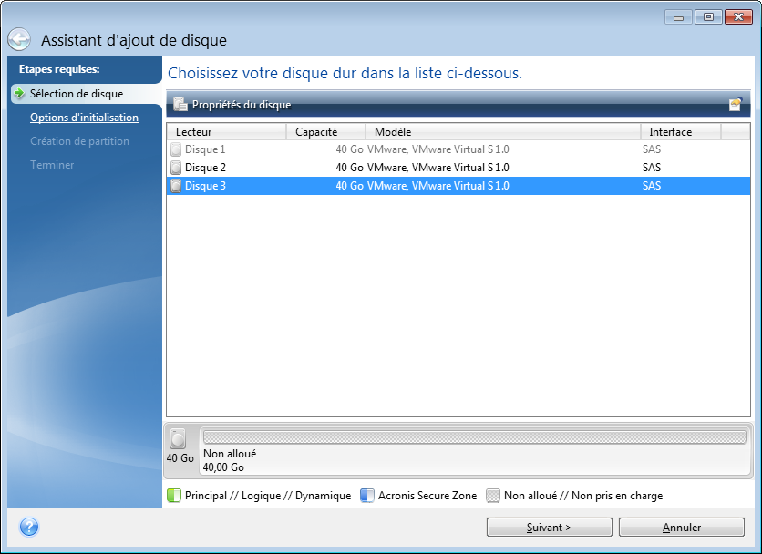Sélectionnez le disque que vous avez ajouté à l'ordinateur. Si vous avez ajouté plusieurs disques, sélectionnez-en un, puis cliquez sur Suivant pour continuer. Vous pourrez ajouter les autres disques plus tard en redémarrant l'assistant d'ajout d'un nouveau disque.