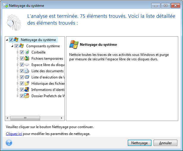 Cliquez sur Nettoyage pour lancer la suppression des éléments trouvés.