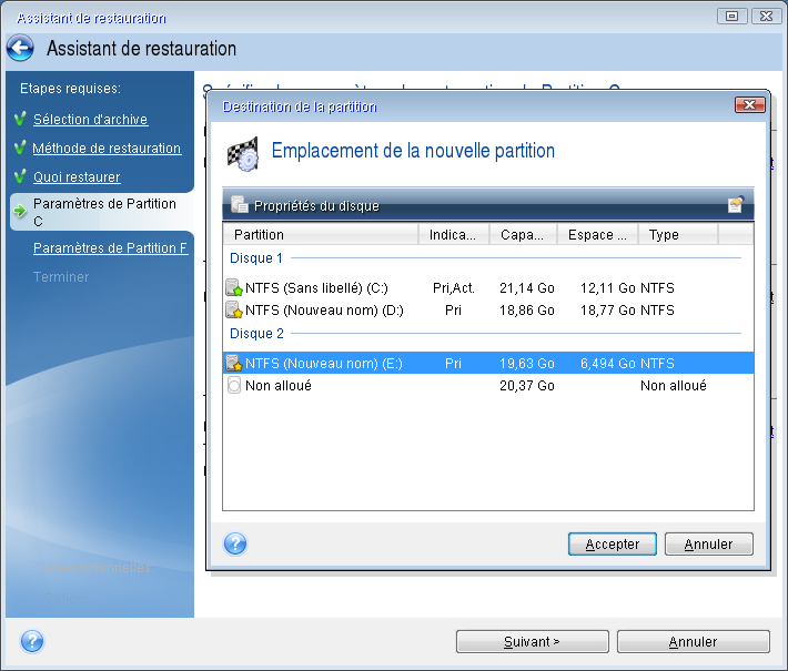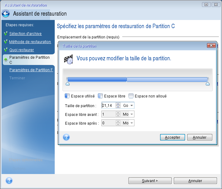 Taille. Dans la zone Taille de la partition, cliquez sur Modifier la partition par défaut. Par défaut, la partition occupe l'intégralité de l'espace du nouveau disque. Saisissez la taille correcte dans le champ Taille de la partition (cette valeur vous est indiquée à l'étape Quoi restaurer). Ensuite et si nécessaire, faites glisser la partition jusqu'à l'emplacement qui vous a été indiqué dans la fenêtre d'informations sur la sauvegarde. Cliquez sur Accepter.