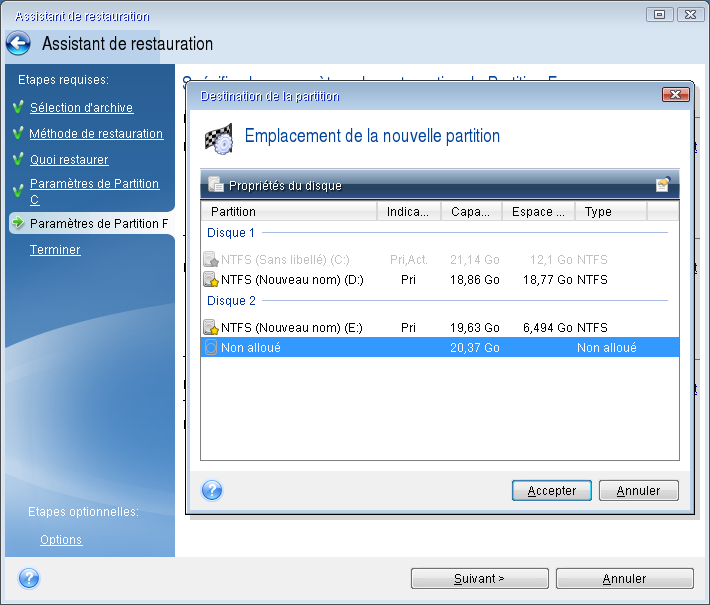 Spécifiez la taille de la partition qui, par défaut, est identique à la taille d'origine. Il n'y a généralement pas d'espace libre après la partition. Par conséquent, allouez la totalité de l'espace non alloué du nouveau disque à la seconde partition. Cliquez sur Accepter, puis sur Suivant.