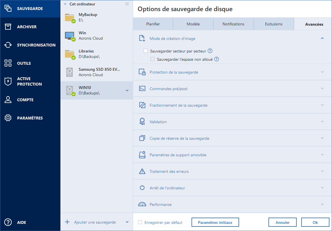 Après que vous ayez installé l'application, toutes les options sont configurées à leurs valeurs initiales. Vous pouvez les modifier pour votre opération de sauvegarde uniquement ou pour toutes les sauvegardes qui seront créées à l'avenir. Cochez la case Enregistrer les paramètres en tant que paramètres par défaut pour appliquer les paramètres modifiés à toutes les autres opérations de sauvegarde par défaut.