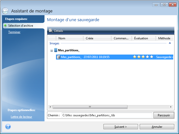 Le montage d'images en tant que lecteurs virtuels vous permet d'accéder aux images comme s'il s'agissait de lecteurs physiques. Vous pouvez monter des sauvegardes locales qui contiennent des partitions ou des disques, puis sélectionner les partitions à monter. Après le montage :