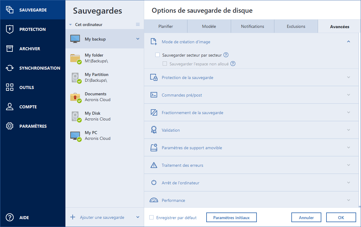 Après que vous ayez installé l'application, toutes les options sont configurées à leurs valeurs initiales. Vous pouvez les modifier pour votre opération de sauvegarde uniquement ou pour toutes les sauvegardes qui seront créées à l'avenir. Cochez la case Enregistrer les paramètres en tant que paramètres par défaut pour appliquer les paramètres modifiés à toutes les autres opérations de sauvegarde par défaut.