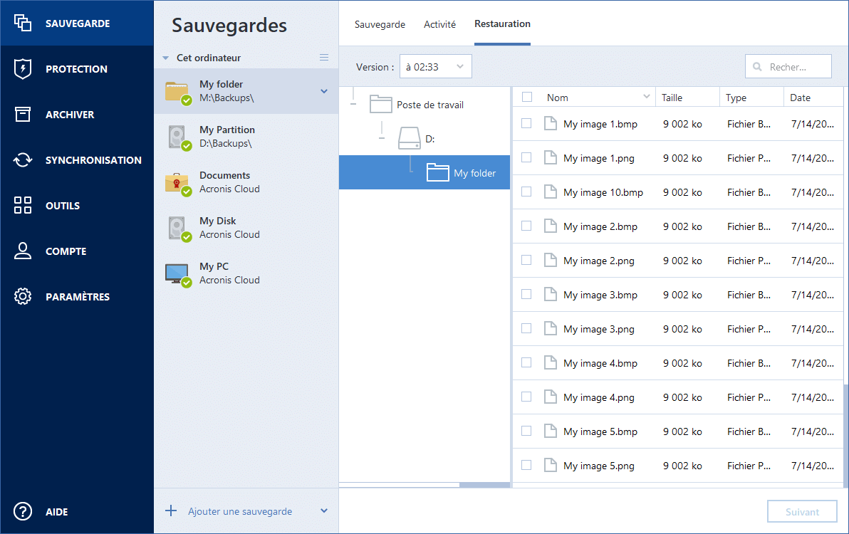 Sélectionnez la case correspondant aux fichiers ou dossiers que vous souhaitez restaurer et cliquez sur Suivant.