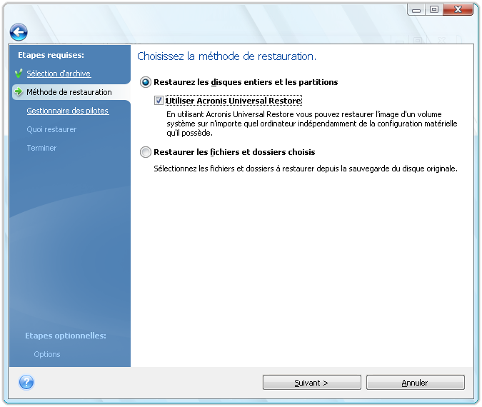 Choisissez Restaurer les disques et partitions en entier et activez la case Utiliser Acronis Universal Restore.