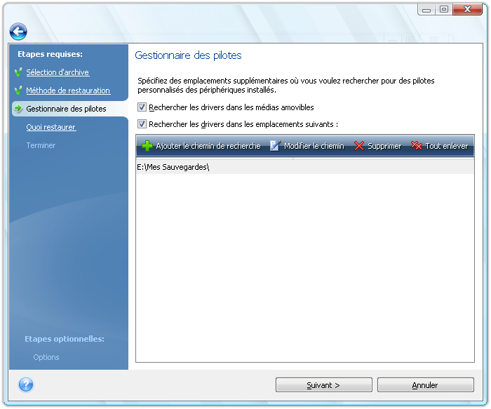 - le dossier ou les dossiers de stockage des pilotes spécifiés à cette étape ; et