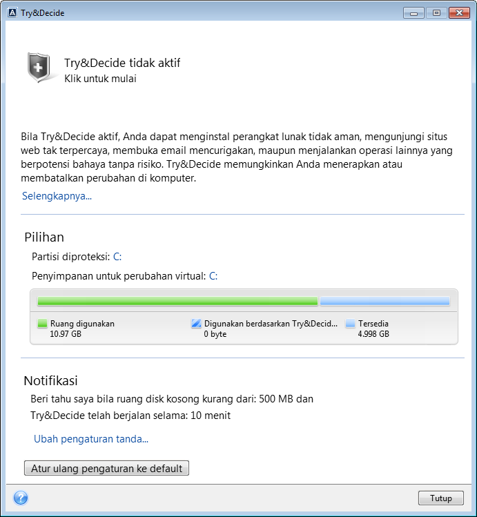 Anda dapat terus mengaktifkan Try&Decide selama mungkin, karena mode ini akan tetap aktif meskipun sistem operasi di-boot ulang.