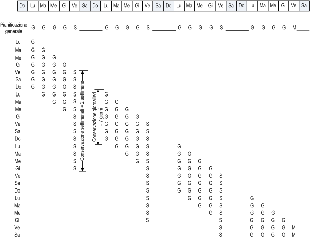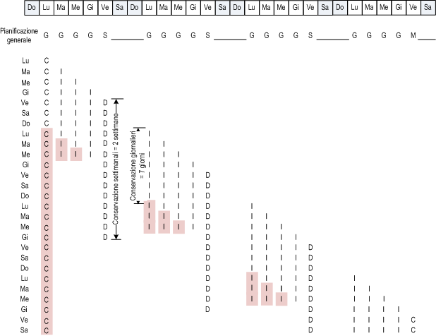 La colonna a sinistra indica i giorni della settimana. Per ogni giorno della settimana viene mostrato il contenuto dell'archivio dopo il backup regolare e la successiva pulizia.