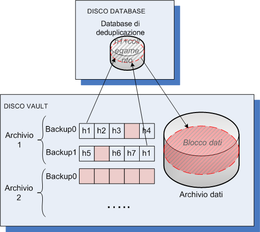 Di conseguenza, l'archivio dati contiene una serie di blocchi di dati unici. Ogni blocco dispone di uno o più riferimenti dai backup. I riferimenti sono contenuti nel database di deduplicazione. I backup rimangono intatti. Contengono valori hash e i dati che non è possibile deduplicare.