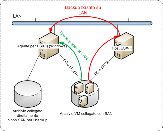 Il diagramma di seguito illustra un backup basato su LAN e uno senza LAN. L'accesso senza LAN alle macchine virtuali è disponibile se si dispone di una SAN (Storage Area Network) Fibre Channel (FC) o iSCSI. Per eliminare completamente il trasferimento dei dati del backup tramite la LAN, archiviare i backup su un disco locale della macchina dell'agente o in una periferica collegata a una SAN.