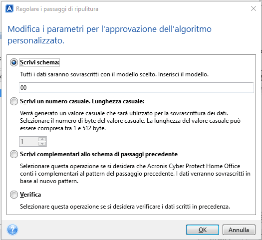 Ogni riga definisce un'operazione che verrà eseguita durante un passaggio. Per creare un algoritmo, aggiungere alla tabella le righe che si reputano sufficienti per distruggere in modo sicuro i dati.