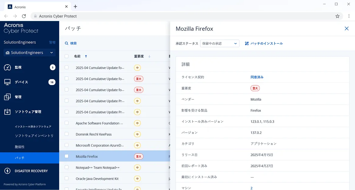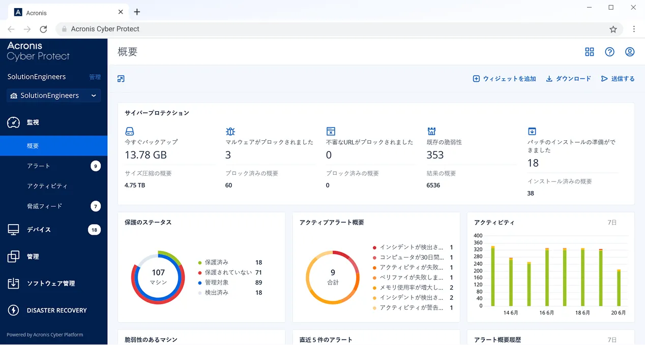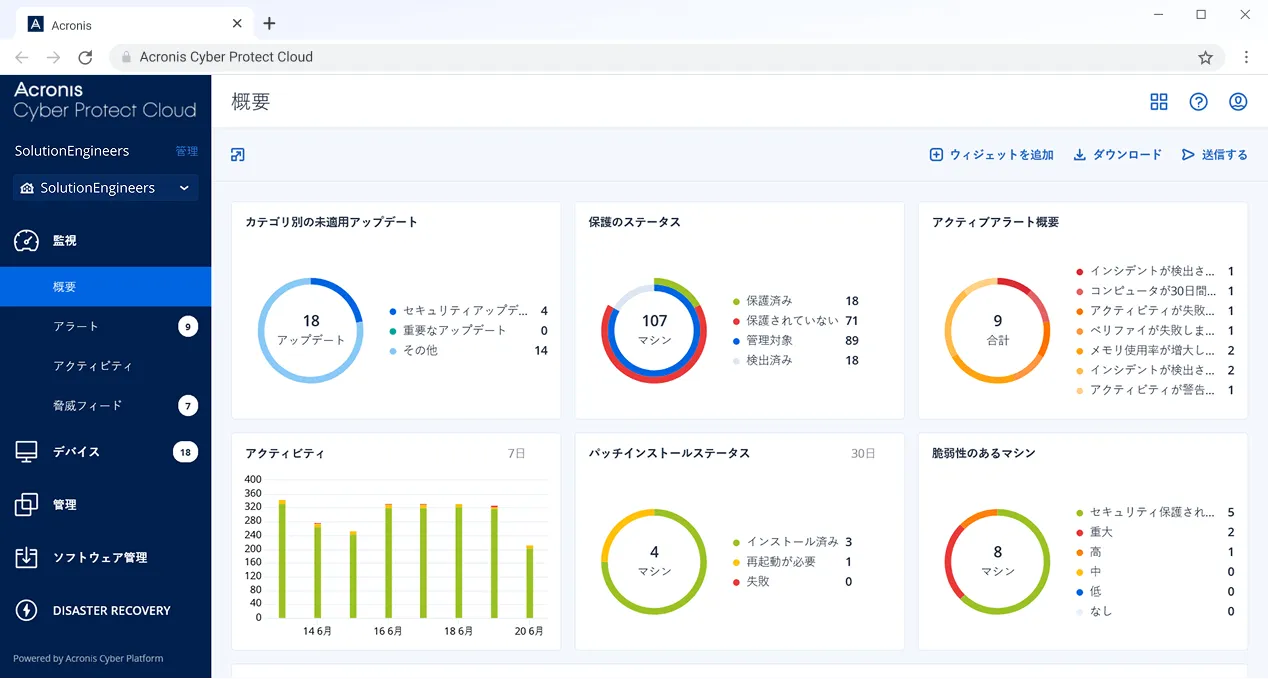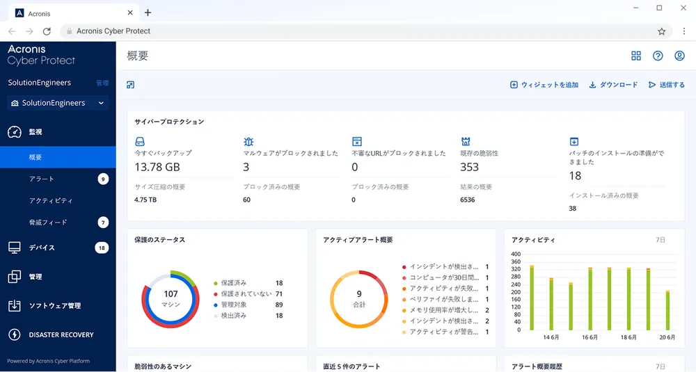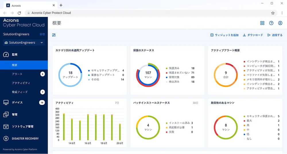 「セキュリティ」「バックアップ」「マネジメント」を統合し、他社の追随を許さないシンプルさで、圧倒的なIT保護=ビジネス保護を実現します。アクロニスはこのサイバープロテクションを直接、企業・団体・組織・個人へ、また、マネージドサービスプロバイダー(MSP)を通して提供します。