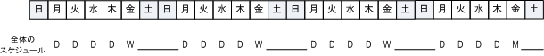 「D」は日単位と見なされるバックアップを表します。 「W」は週単位と見なされるバックアップを表します。 「M」は月単位と見なされるバックアップを表します。