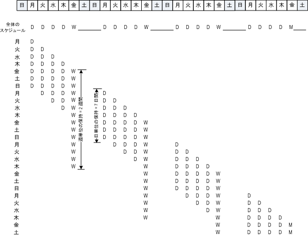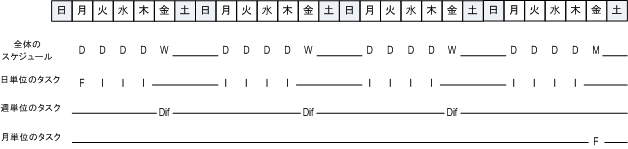 [週単位/月単位]パラメータにより、全体のスケジュールが日単位、週単位、および月単位のスケジュールに分割されます。