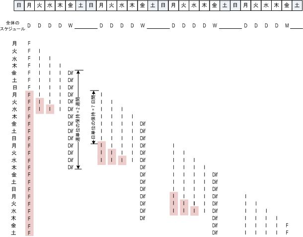 [週単位/月単位]のバックアップで金曜日を選択したとします。 選択内容に従ってラベルを付けた全体のスケジュールは次のようになります。