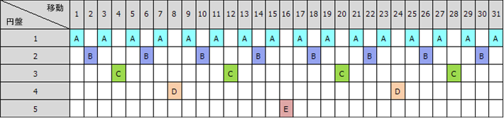 たとえば、A、B、C、D、E というラベル付きの 5 つの円盤がある場合、この解き方では次の順序で円盤を移動します。
