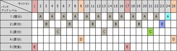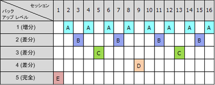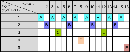 次の表は、5 レベルのバックアップ スキームのパターンを示しています。パターンは 16 セッションから構成されます。
