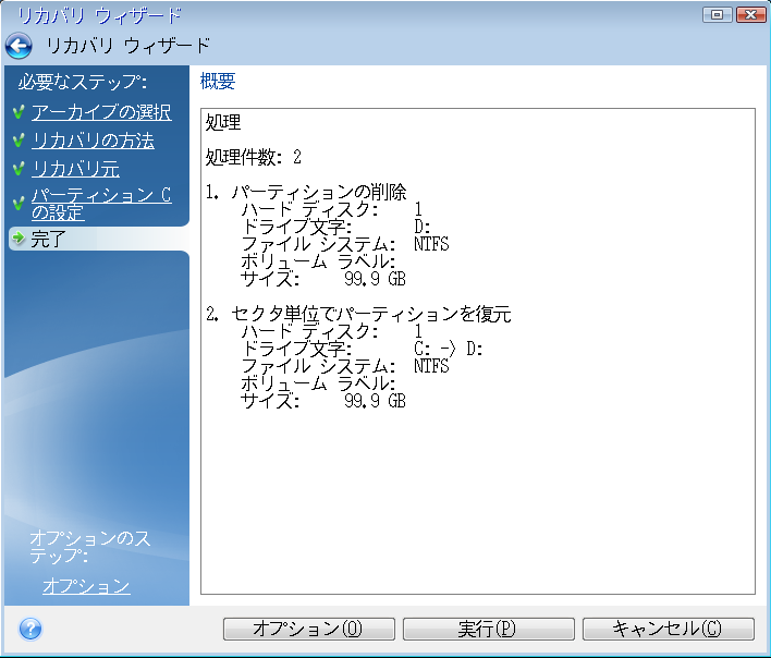 - [完了] の画面で処理の概要を確認します。パーティションのサイズを変更していない場合は、[パーティションの削除] 項目と [パーティションの復元] 項目のサイズが一致している必要があります。概要を確認して、[実行] をクリックします。